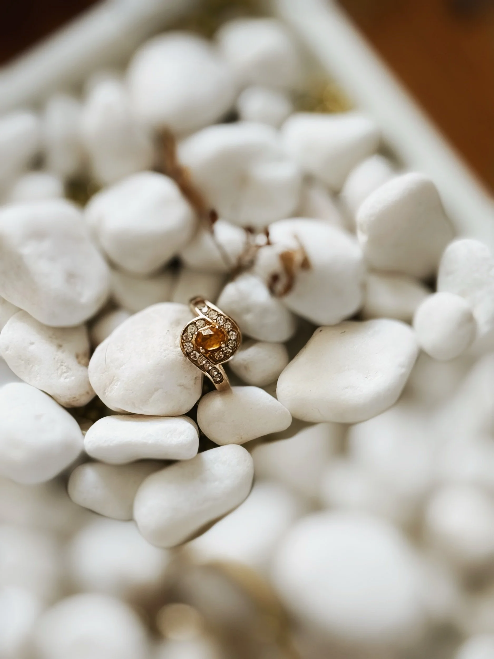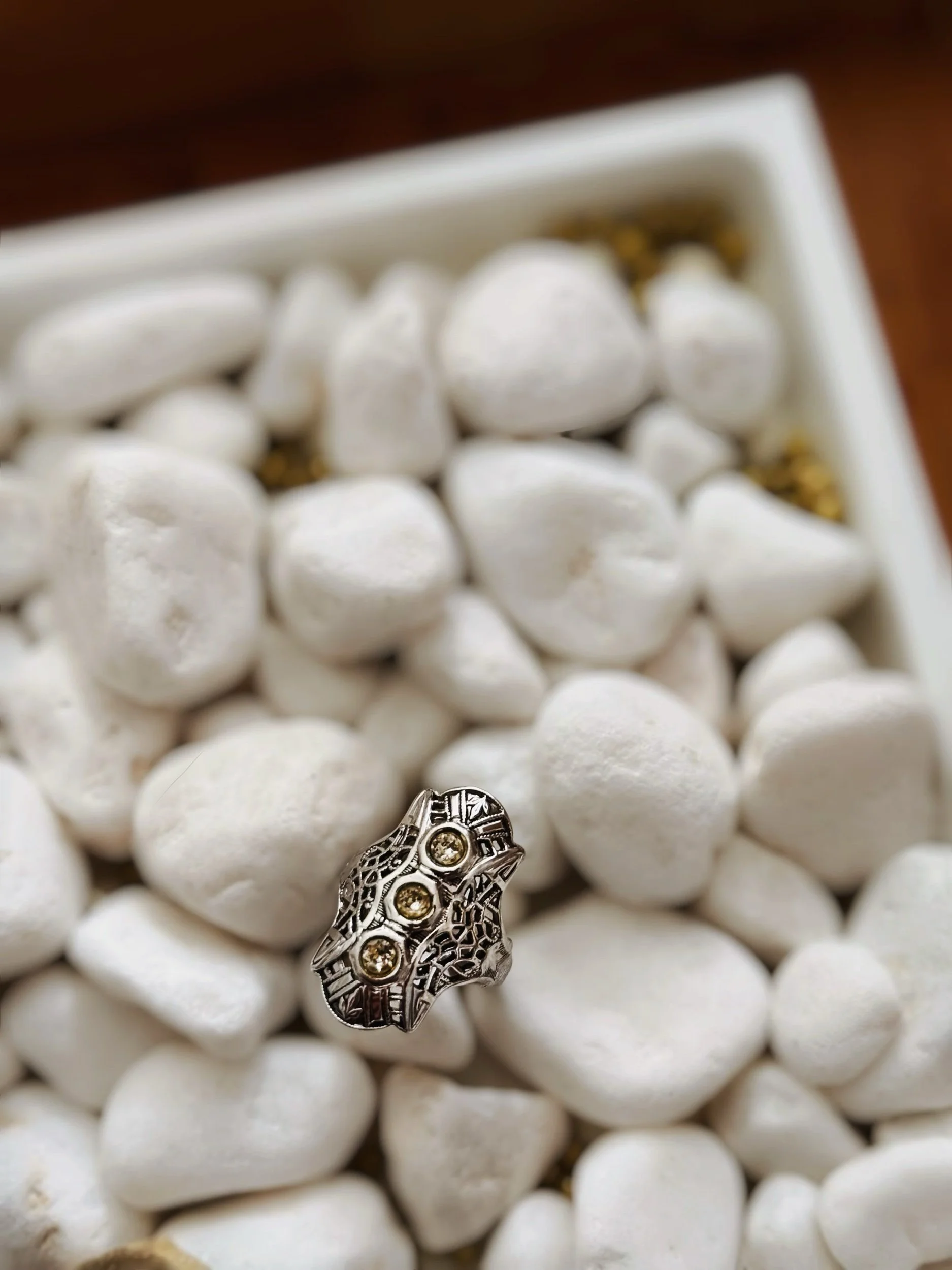 The Vintage Triple Glow Filigree Ring is a true statement piece inspired by old-world charm and intricate craftsmanship. Designed with an ornate silver-tone filigree base, this ring features three warm golden crystals aligned through the center — each one catching the light with a soft, honey-like shimmer.