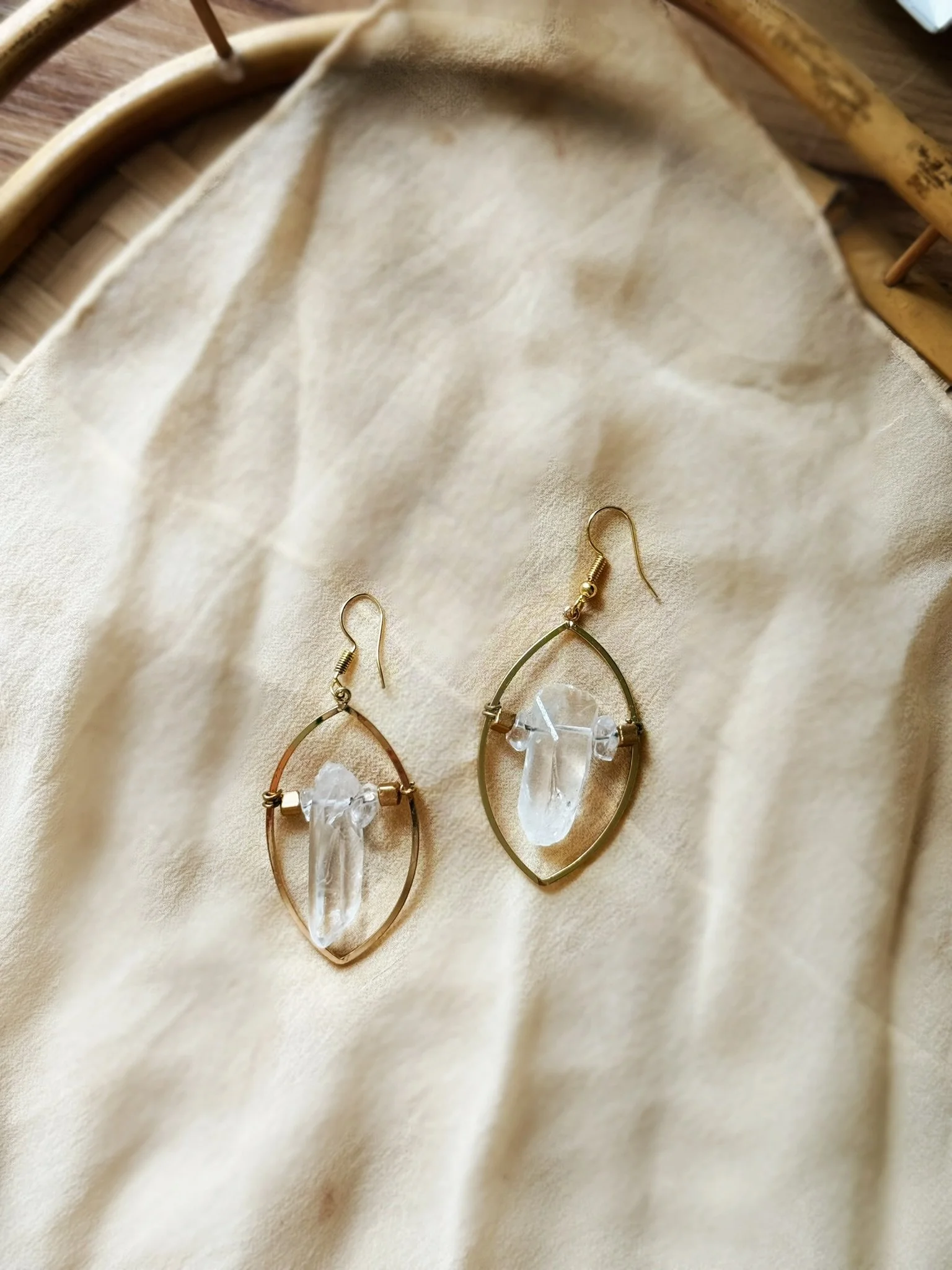 Framed in a glowing gold oval, these crystal quartz points radiate natural beauty. Some pairs sparkle with stardust or golden bead accents, offering a one-of-a-kind touch for the ones who love earthy elegance with a hint of glow