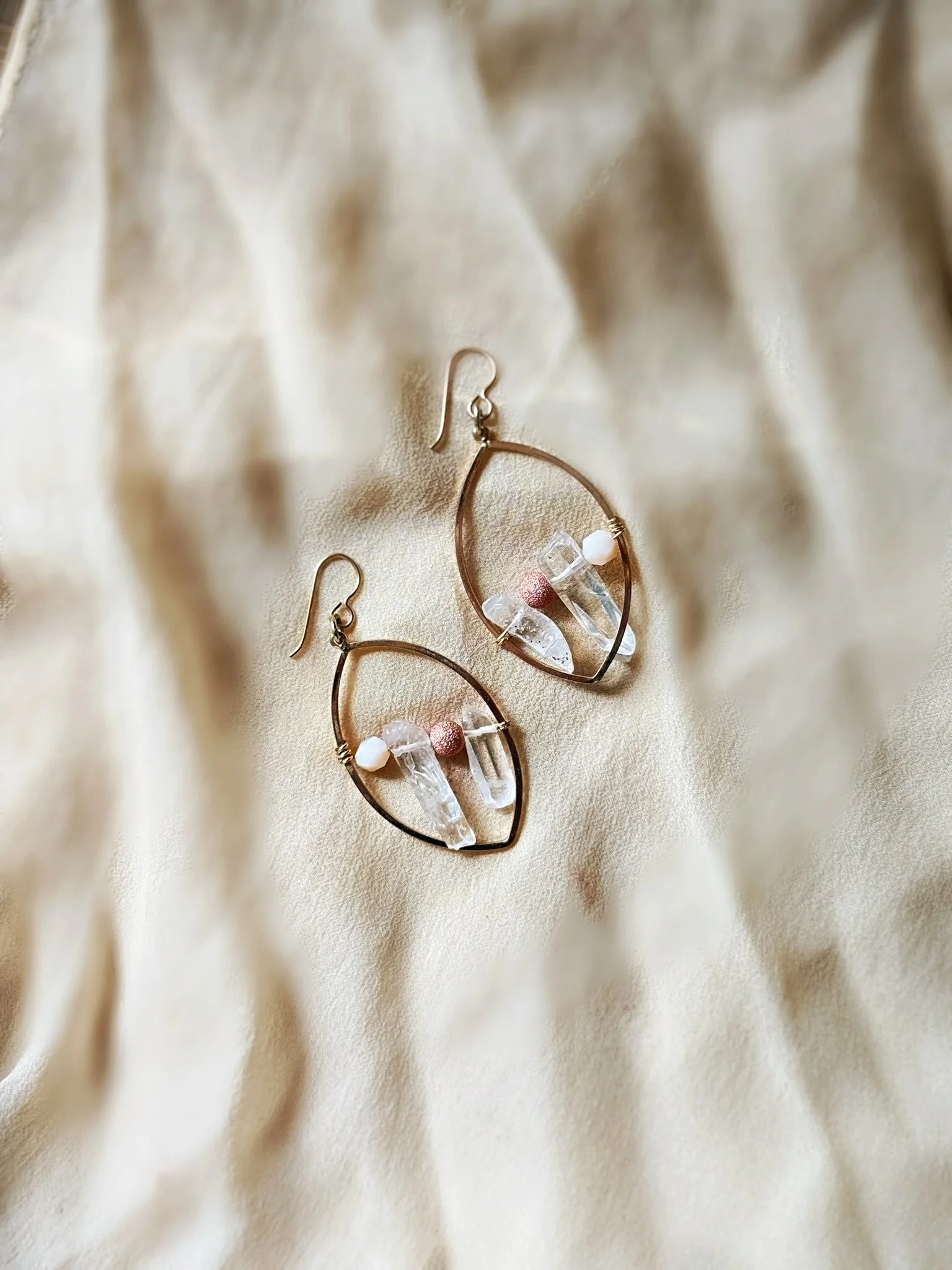 Soft shimmer meets strong shape. The Stardust Oval Earrings are framed in gold, holding clear crystal quartz and glimmering rose gold stardust beads — a blend of grounded beauty and delicate glow.